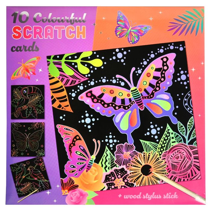 Maak je eigen kunstwerk met deze set van 10 kraskaarten met motieven. Kras met de bijgeleverde pen over het zwarte oppervlak en laat een kleurrijk patroon verschijnen. Perfect voor kinderen, creatieve workshops of een ontspannen knutselmoment!