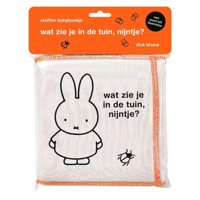 De bekende illustraties van Dick Bruna zijn ook in zwart-wit een lust voor het oog! Dit boekje is speciaal geschikt als eerste boekje voor een baby, maar ook leuk om samen te bekijken met een dreumes. In de tuin ziet Nijntje allerlei beestjes: van een kever en een slak tot een egel. En kijk, daar loopt een muis! Wat zie jij bij jou in de tuin? Het katoenen boekje is lekker zacht en geschikt voor kinderen van alle leeftijden. Het boek kan gewassen worden en de stevige pagina’s zorgen ervoor dat het boek rechtop kan staan. Tip: leg een baby op de buik voor het rechtopstaande boekje (onder toezicht). Het bekijken van de plaatjes stimuleert zo de motorische ontwikkeling.